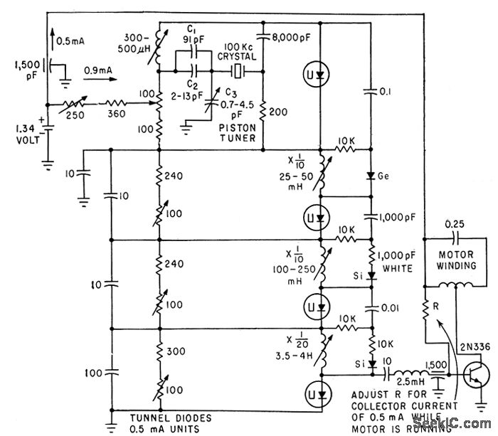 Trimmers permit adjusting timing by a few seconds per year.Major error is due to aging of quartz crystal,Tunnel diodes divide 100-kc crystal frequency by 2,000 to give 50-cps output for driving motor of clock.-R. L. Watters, Tunnel Diodes Control Quartz-Crystal Chronometer, Electronics, 34:39, p129-131.