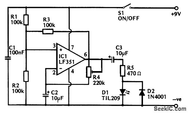 The circuit diagram for the 1-s flasher is based on an operational amplifier that is biased by R1, R2, and R3 to act as a form of Schmitt trigger. The output goes to the low state if the inverting input is taken above 2/3V+, and high if it istaken below 1/3V+. The output, therefore, goes high initially, but C2 soon charges to 2/3V+ via R4, and then the output, goes low. Capacitor C2 then discharges to 1/3V+ via R4, sending the output high again, and producing continuous oscillation. ResistorR4 is adjusted to give an operating frequency of 1 Hz. The 1-s flasher can be calibrated against a watch or clock with asecond hand by empirical means. The output of IC1 is coupled to the LED indicator, D1, by way of dc blocking capacitor C3and current-limiting resistor R5, and the LED is briefly pulsed on as the output voltage swings positive. Diode D2 ensures that there is both a charge and a discharge path for C3 so that the output signal is properly coupled to D1. The current consumption of the unit is about 2 mA.