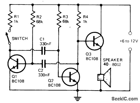 The circuit consists of a multivibrator (Q1 & Q2), and a low power output stage Q3. The speaker should have an impedance in the region of 40 to 80 ohms. To use a low impedance speaker, connect an output transformer from the emitter of Q3 to ground. C1 and C2 determine the pitch of the siren and the values specified will provide a tone of about 300 Hz.Quiescent current is negligible. The output at the collector of Q2 can also be fed into an amplifier input via a 1 pF electrolytic, in series with a 12 k resistor.