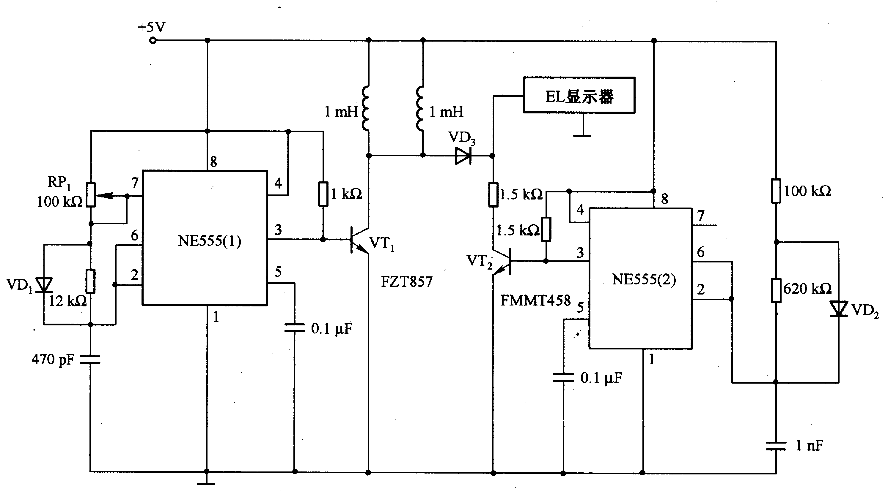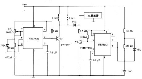 Light-emitting EL display has the advantages of long life (about l00OOh), light uniformity and low loss, and it is equivalent to the LCD for low-light-emitting display, which includs mobile phone, watch and automated meter display. The conventional EL drive circuit uses flyback converter to produce enough high-voltage EL light, if taking into account the cost of the converter and the space, this solution is too expensive. The advantage of EL display driver is that it is composed of low-loss NE555 and several switching transistors.