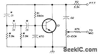 Release of push-to-talk (PTT) switch at end of radio conversation activates time delay for antenna changeover relay, keeping transmitter on air long enough to transmit 800-Hz tone burst indicating transmission termination. Tone is generated in simple one-transistor phase-shift oscillator powered by voltage present between PTT terminal and ground in receive mode of transceiver, which may be any voltage between 6 and 30 VDC. Transistor can be any small-signal NPN silicon with gain of at least 300 at 1 mA, such as 2N930. Parts marked with asterisk must be matched within 5%.-E. Hombostel, Automatic Beeper for Station Control, Ham Radio, Sept. 1976, p 38-39.