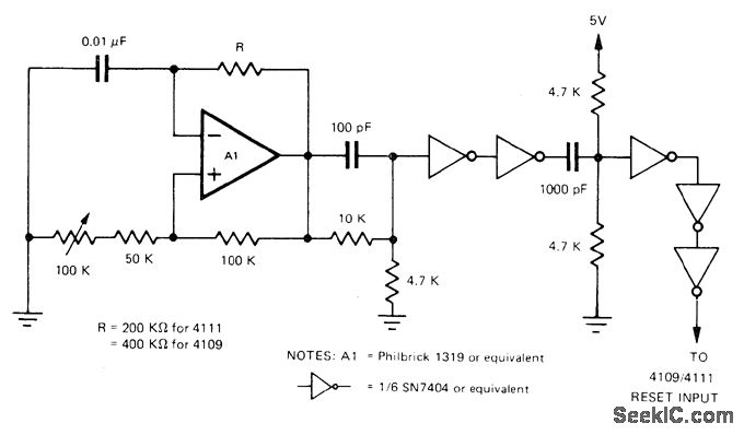 Generates pulse with 100-ns minimum width in range of 125-250 Hz for application to reset input of Teledyne Philbrick A/D converter in applications requiring un attended operation with continuous conversion. Adjust 100K pot to give 125 Hz for 4109 or 250 Hz for 4111. Successive stages of SN7404 inverter provide required sharpening of pulse.A1 is positive-starting MVBR.—R. W. Jacobs, Repetitive Mode Operation for Models 4109/4111 Integrating A/D Converters, Teledyne Philbrick, Dedham, MA, 1977, AN-28.