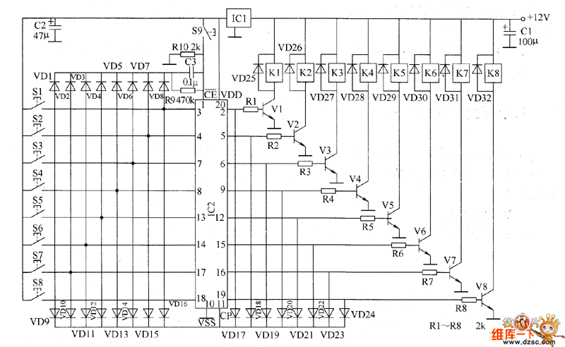 The 8-way lock electronic switch circuit is composed of the regulator filter circuit, input control circuit, latch circuit and control implementation circuit, and the circuit is shown as the chart. Regulator filter circuit is composed of the three terminal voltage regulator integrated circuit IC1 and filter capacitors C1, C2. Input control circuit consists of the control buttons S1 ~ S8, diodes VD1 ~ VD16. Latch circuit consists of eight D flip-flop integrated circuits IC2 and reset button S9, resistors R9 and R10, capacitor C3. Control implementation circuit is composed of the transistors V1 ~ V8, diodes VD17 ~ VD32, resistors R1 ~ R8 and relays K1 ~ K8. R1 ~ R10 uses 1/4W carbon film resistors or metal film resistors.