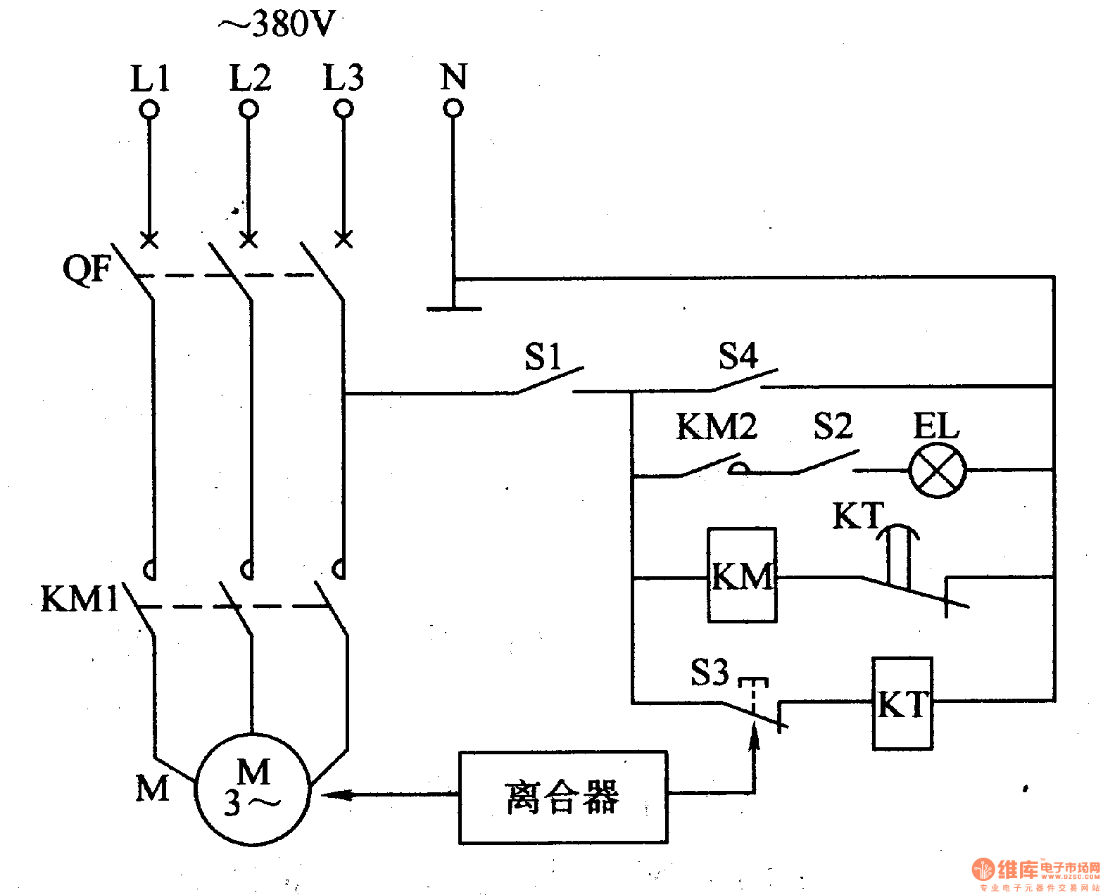 When it is used, the low high circuit breaker QF is turned on, then S1, S2 are turned on, the sewing worker puts her feet on the clutch pedal, the foot switch S3 is cut off, KM pulls in, its normally open contact KM1 is connected, the motor M starts running, light EL turns on, the work can start to sew.