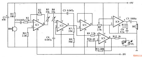 This electronic stethoscope circuit is composed of pickup sensor, preamplifier, low-pass filter amplifier, buffer, audio amplifier, LED display circuit, it is shown in the figure 9-136.