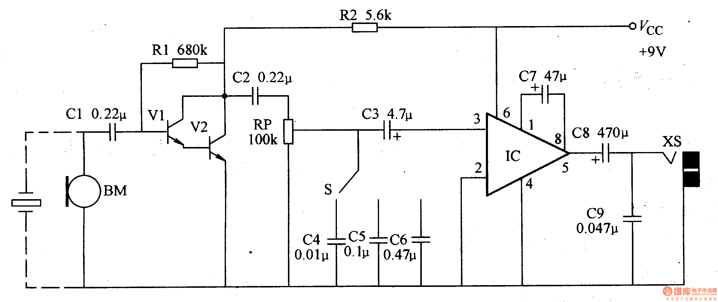 The microphone BM is fixed to the probe of stethoscope, it can change the sound singal such as body heart, lung, pulse into electrical signal, it is coupled to V1's base by C1, after passing V1, V2 preamplifiers and tone, volume control, it is imported from 3-foot of power amplifier IC. The audio singal is exported from 5-foot by IC amiplifier, then it is coupled to earphone socket XS by C8, at last, it restores the amplified sound by external earphone.