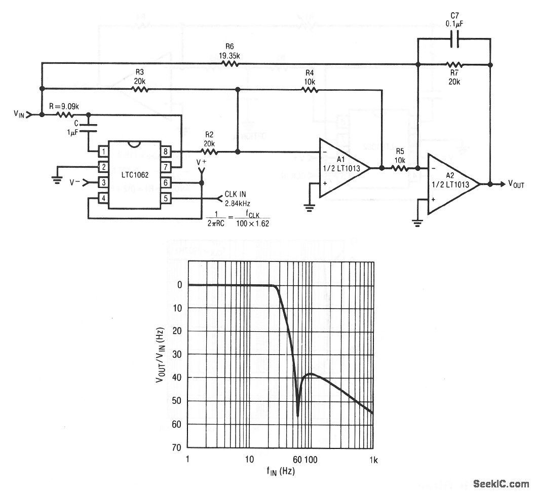 This circuit is similar to that of Fig. 7-17, but uses two sections of an LT1013 following the LTC1062. Figure 7-18B shows the frequency response for a 60-Hz notch filter that uses the values and equations of Fig. 7-18A. Linear Technology Corporation, Linear Applications Handbook, 1990, p. AN20-10,-11.