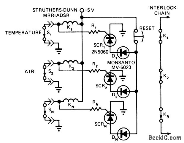 Developed for protecting people and equipment at 40-kW RF accelerator station. All interlock switches (air flow, water flow, water pressure, temperature, etc) are normally closed, grounding one side of each relay coil. All relays are normally pulled in, to provide complete interlock chain. Failure of any component, including power supply, breaks chain and places system in safe mode.-T. W. Hardek, Interlock Protection Circuit Is Simple and Fail-Safe, EDN Magazine, May 20, 1975, p 74.