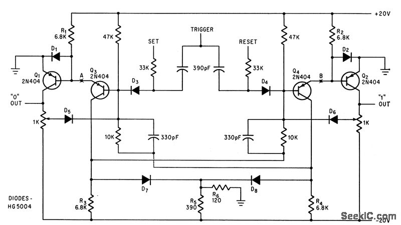 Fan-out of conventional flip-flop is quadrupled by driving bases of amplifiers Q1 and Q2 directly from emitters of Q3 and Q4.-D. J. Grover, Modified Flip-flop Quadruples Fan-Out, Electronics, 38:26, p 67-68.