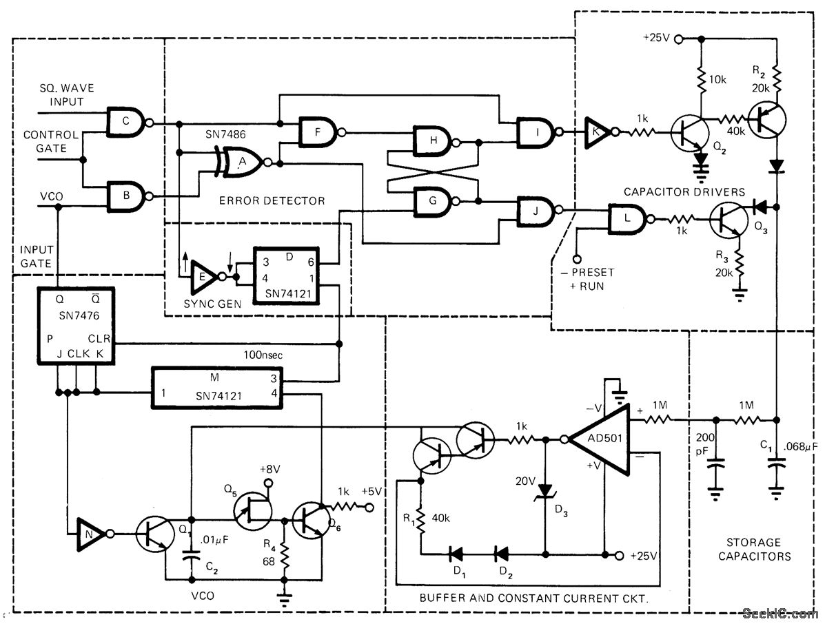 Circuit was developed to reduce the normally long acquisition time of phase-locked loops when measuring frequency of short signal bursts. Synchronization of VCO to input phase allows correction pulses to be developed in correct polarity only, to give lockup time less than 10 cycles of input when using idling frequency of 12 kHz for VCO. Input signals are compared to those of VCO at EXCLUSIVE-OR gate A. Gating of error pulses by gate F and flip-flop G-H allows I or J to drive current pulses of correct polarity into C1. Voltage correction on C1, controlled by values of R2 and R3, is proportional to width of error pulses. Article covers circuit operation in detail.-R. Bohlken, A Synchronized Phase Locked Loop, EDN Magazine, March 20, 1973, p 84-85.