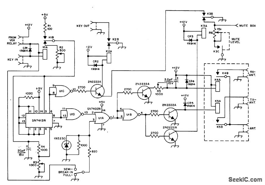 Permits operator to hear signals even between dots while calling DX station, so call can be stopped if DX station answers someone else. Timing circuit ensures that transmitter is not producing power when relays open, permitting use of small high-speed relays. K1-K4 are common reed relays. K5 should have contacts rated for 300 VAC at 500 mA.-A. Pluess, A Fast aSk System Using Reed Relays, QST, Dec. 1976, p 11-12.