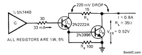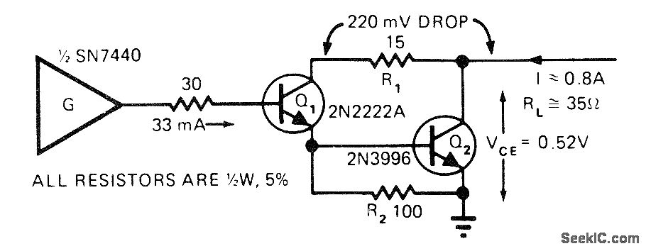 Driver Q1 is low-power device with fast switching time, while power transistor Q2 handles power dissipation and amperes of current being switched. Used in TTL circuits requiring fast solid-state switches having known and repeatable switching times. Cur-rent reaches maximum in about 50 ns.-C. Venditti, Fast Power Switch Self-Corrects for Degradation, EDN Magazine, Jan. 20, 1975, p 59-60.