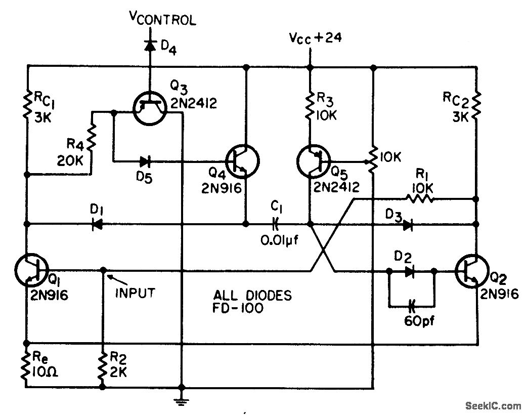Dynamic period can be varied linearly over range of 20 to 425 microsec. Retrigger time is only 3 microsec for short periods and 14 microsec for longest periods. Circuit is conventional except for d-c isolation diode D1 and drive resistor R4.-R. S. Hughes, A linear, Voltage-Variable One-Shot With Fast Retrigger Time, EEE, 13:5, p 78-79.