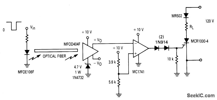 An op amp is used to interface between a fiberoptic system and the MOS SCR to multi-cycle,half-wave control of a load.This recelver has two complementary outputs,one at a quiescent level of about 0.6 V and the second at 3 V.By adding a 4.7 V zenerh senes with the return bus,the effective Vcc becomes 5.3V and also the 0.6V outputlevel is translated up to about 5.3 V.This level IS compatible with the reference input(5.9V) of the singleļ¼ended powered op-amp acting as a comparator.