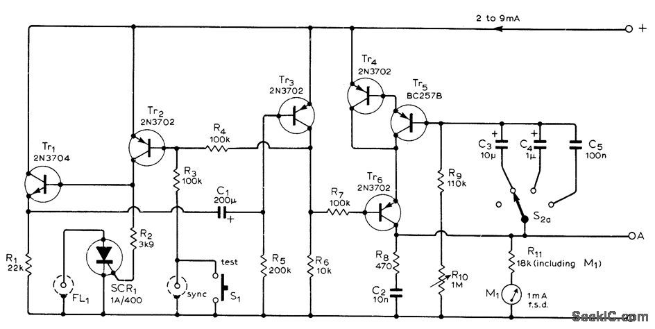 Used in instrument designed to trigger up to five individual flash units at equal increments of time that can rangefrom 11 ms to 11s, as required for such assignments as taking sequence photographs of springboard diver in flight. Transistors Tr1, Tr2, and Tr3 form monostable MVBR that is switched to unstable state by negative pulse applied to base of Tr2 by SCR1 when camera shutter contacts FL1 are closed. Timing circuit Tr4-Tr5-Tr6 provides ramp output at A for feeding voltage-operated switches set to trip at different points of ramp waveform as required for triggering flashes in sequence. Article gives all circuits and setup procedure. Regulated 19.5-V supply is required.-R. Lewis, Multi-Flash Trigger Unit, Wireless World, Nov. 1973, p 529-532.