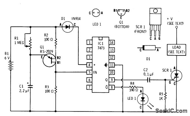 UJT relaxation oscilllator al serves as clock for driving section of 7473 dual flip-flop,One output of flip-flop-flashes Radio Shack 276-041 red LED to indicate operating status,Other output alternately triggers SCR which can be 6-A 50-V 276-1089,for COMPARATOR LED FLASHER-One section of LM339 quad comparator drives two RS2016 NPN transistors having LED load, to give simple flasher for classroom demonstrations. Circuit can be duplicated with other three sections to give four flashers. Connecting R2 to pin 1 of IC flashing lamp load. Load and SCR supply voltage depend on application but must be within SCR rating.-F. M. Mims, Semiconductor Projects,Vol. 2, Radio Shack,FortWorth,TX, 1976, p 62-70.