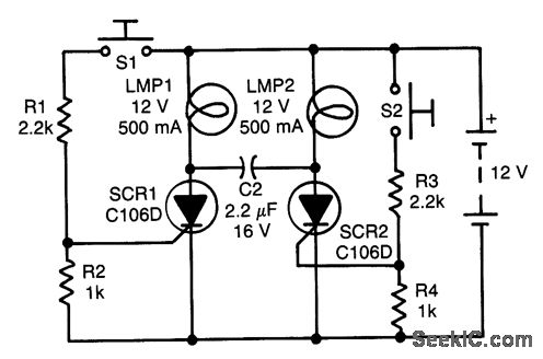 Assume first that SCRt is on and SCR2 is off so that C1 is fully charged, with its LMP2 end positive. The state of the circuit can be changed by pressing S2. As SCR2 turns on, it turns SCR1 off capacitively via its anode. Capacitor C1 then recharges in the opposite manner (i.e., the left end is now positive). The state of the circuit can be changed again by pressing S1, thus driving SCR1 on by way of its gate, and driving SCR2 off capacitively via its anode.