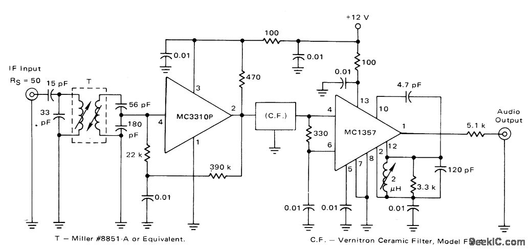 Uses MC1357 quadrature detector after ceramic filter to give IF bandwidth required for good stereo reproduction.Sensitivityis 18 μV for 3% total harmonic distortion.-''Integrated Circuit IF Amplifiers forAM/FM and FM Radios,'' Motorola,Phoenix,AZ,1975,AN-543A,p 6.
