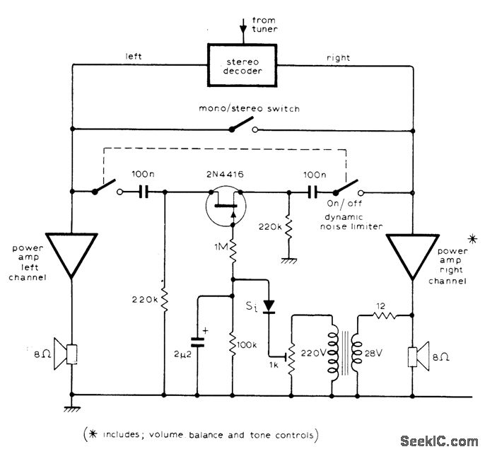 Circuit acts as noise limiter to help produce pseudostereo sound having reduced noise, to offset noise signal heard during weak passages during stereo reception of FM stations. FET short-circuits both audio channels when audio signal strength drops sufficiently to make noise objectionable. H this voltage is insufficient to drive FET, amplifier or transformer must be used.-J. W. Richter, Stereo Dynamic Noise Limiter, Wire-less World, Oct, 1975, p 474.