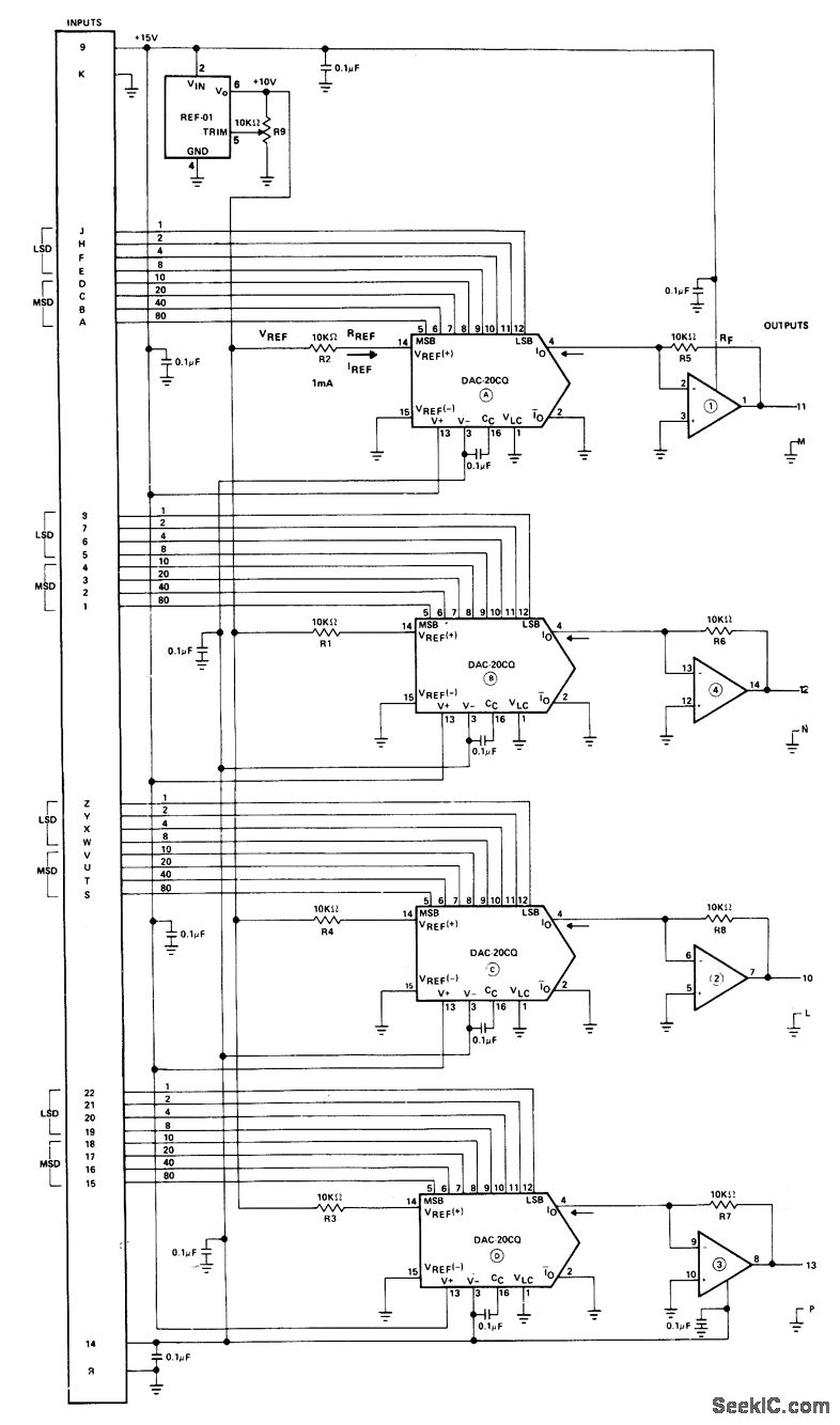 Uses four Precision Monolithics DAC-20CQ 2-digit BCD D/A con verter, OP-11FY precision quad opamp, and REF-01HJ +10 V voltage referenceto convert 2-digit BCD input coding to proportional analog 0 to +10 V output for each of four channels.Same configuration will handle binary inputs, as covered in application note. For output range of 0 to +5 V, change voltage reference to REF-02.—D. Soderquist, Low Cost Four Channel DAC Gives BCD or Binary Coding, Precision Monolithics, Santa Clara, CA, 1977, AN-26, p 3.