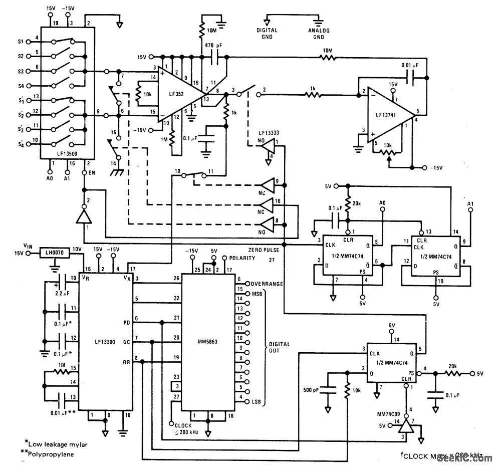 Low-speed high-accuracy data acquisition unit acquires analog input signal differentially with LF13509 IC and preconditions it through LF352 instrumentation amplifier having automatic zeroing circuit. Timing is provided by MM5863 12-bit A/D converter and lower MM74C74 flip-flop. Upper two flip-flops form 2-bit up counter for channel select. Instrumentation amplifier is zeroed at power-up and after each conversion. Maximum clock frequency depends on required accuracy and minimum zeroing time of instrumentation amplifier.- MOS/LSI Databook, National Semiconductor, Santa Clara, CA, 1977, p 5-2-5-22.
