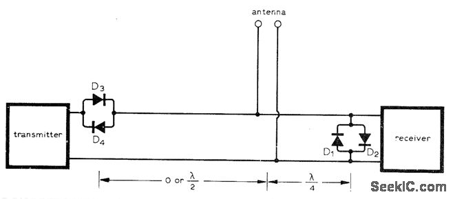Circuit requires only two pairs of high-frequency switching diodes having current ratings appropriate for transmitter power. With diode pairs spaced as shown, impedance at T junction looking toward transmitter is infinite during reception because there is open circuit half a wavelength away created by nonconducting D3 and D4. Line is matched in receiver direction so all incoming power from antenna goes into receiver. When transmitter is on, D3 and D4 conduct and power flows toward antenna, while D1 and D2 also conduct and place short-circuit across receiver input.-A. Lieber, Passive Solid-State Antenna Switch, Wireless World, Jan. 1975, p 12.