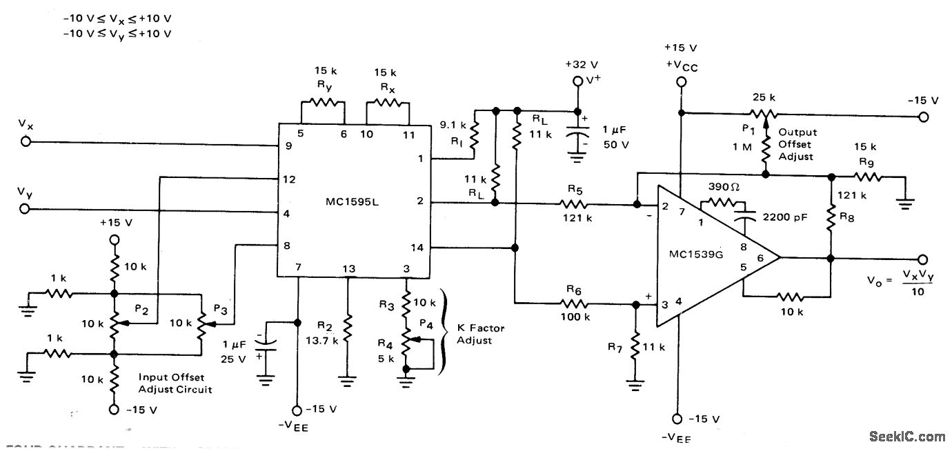 Connections shown for Motorola MC1595L linear four-quadrant multiplier are used in applications requiring level shift to ground reference. Common-mode voltage is reduced by 10:1 attenuation networks, and differential output voltage is fed to opamp having closed-loop gain of 10. Resulting output is stillVxVy/10, which appears single-ended above ground reference. Each input can be between-10 V and +10 V. Frequency limit of circuit is about50 kHz for signal swings approaching ±10 V.-E. Renschler, Analysis and Basic Operation of the MC1595, Motorola, Phoenix. AZ, 1975, AN-489 p 9.