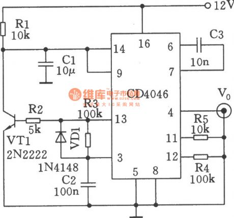 As shown in the figure, it is the VCO of dual D trigger. The circuit outputs a square wave signal with 50% duty cycle, the current consumption is low. When the input voltage is 5~12V, the output frequency range is 20~70KHz. Firstly, presuming IC-A's initial state is Q=low level. Then VD1 is cut off, C1 is charged by R1. When C1's voltage reaches the set level, IC-A is forced to reverse, the Q output terminal turns to high level, C1 is discharged by VD. At the same time, IC-A's CL input terminal turns to low level too, IC-A is forced to Q=low level.