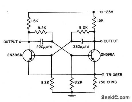 Increased temperature range is obtained at penalty of smaller voltage change at collector, more battery power consumed, and more trigger power required. Capacitor values depend on trigger characteristics and maximum trigger repetition rate.- Transistor Manual, Seventh Edition, General Electric Co., 1964, p 186. (View)
