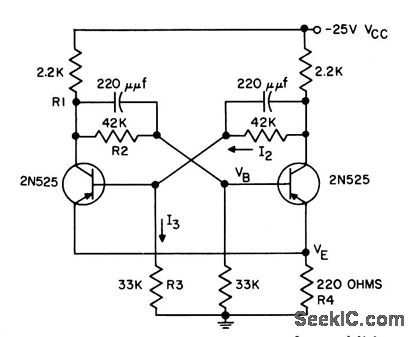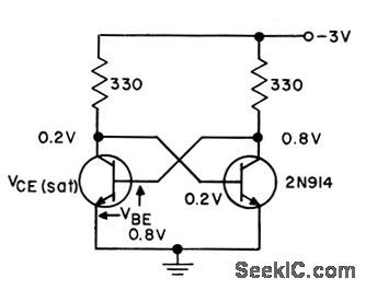 Addition of two 33,000-ohm resistors to basic saturated flip-flop boosts temperature range for stable operation above 50℃.- Transistor Manual, Seventh Edition, General Electric Co., 1964, p 186. (View)