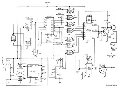 741 opamps and 2N2924 transistors are connected as single-tone encoders producing different audio frequencies、with outputs connected together For2000-Hz tone, use 0.01 μF for c1 and c2 and use 8K for R3 and R4. Formula for frequency of each encoder is f = 0.159/RC where f is in hertz, R in megohms, and C in microfarads; R = R3 = R4 and C = C1 = C2. Frequencies can be chosen for Touch-Tone signaling.-C. D. Rakes, integrated Circuit Projects, Howard W. Sams, Indianapolis, IN, 1975, p 95-97, (View)