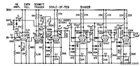 Consists of four cascaded Eccles-Jordan binary dividers with feedback loops, to recycle at 10. Operates up to 500 kc.-J. K. Goodwin, Digital Tachometer Aids in Turbine Design, Electronics, 32:15, p 58-61. (View)