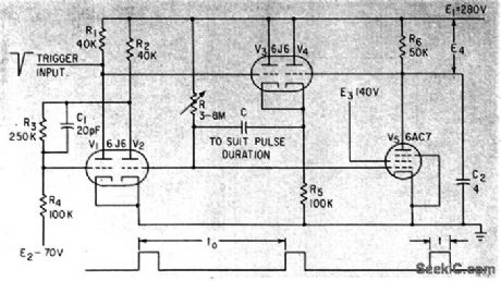 Operates us 10:1 divider at 1,000 pps. Division ratio of mvbr remains constant for supply variations of from 40 to 400 v. Average plate voltage of V5 is adjusted automatically to maintain optimum working conditions throughout operating range.-T. Hornak, Stabilizing Monostable Multivibrators, Electronics, 33:45, p 76. (View)