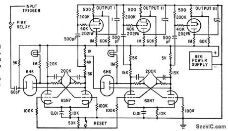 Uses two bistable flip-flops in series as frequency divider for controlling firing of huge capacitor bank. Three outputs deliver pulses with times related to input frequencies.-R. Buser and P. Wolfert, Experimental 100,000 Joule Capcitor Bank for Plasma Research, Electronics,33:32, p 58-61. (View)