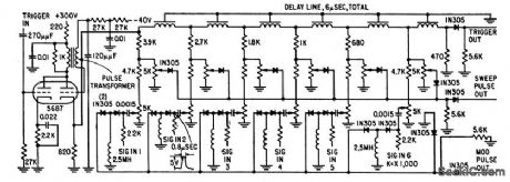 When double-triode blocking oscillator is fired by input trigger, it delivers 0.6-microsec pulse into 1-microsec delay line which, in turn, delivers pulse to next delay line. After sixth delay, pulse is used as trigger for next ring unit.-M. T. Nadir, Microsecond Sampler Handles 126 Channels, Electronics, 32:4, p 36-39. (View)