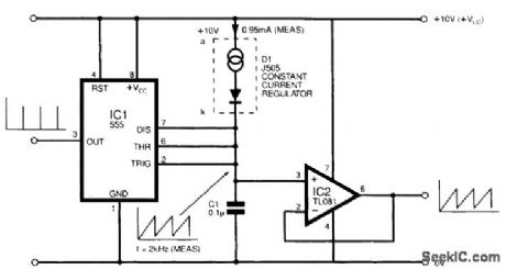 When the timing capacitor of an ordinary 555 circuit charges, an exponential curve across the capacitor results. Obviously, a fast-rising square wave is seen at the output. An accurate ramp voltage can be generated by the 555, though, by ignoring the square-wave output and sneakily using a constant-current source instead of the resistor charging network. The figure shows how a simple J505 constant-current diode can be used to create a reasonable ramp, which will be observed across the capacitor C1. D1 is specified at 1 mA nominal. Assuming that C1 is discharged initially, after power-up the 555 triggers (Vtring, <1/3 Vcc), and C1 starts to charge at a fixed rate through the constant-current source D1 until the threshold voltage of 2/3 Vcc is reached. Then the 555 (IC1) will rapidly discharge the capacitor into pin 7 down to1/3Vcc, when the chip will trigger again. With a 12-V rail, the result is a sawtooth waveform of 4 V p-p. A fast series of spikes is seen at pin 3. (View)