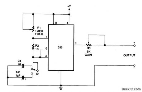 The use of an NE555 allows generation of signals from 1 Hz to higher than 10 kHz. The output is a square wave. (View)