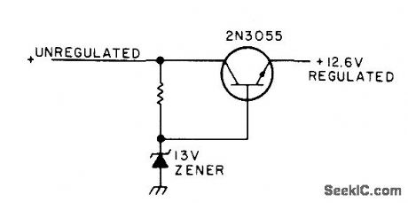Simple circuit has no effect on normal operation of CB transceiver or other solid-state equipment in auto but provides overvoltage protection if voltage regulator in auto fails. Use heatsink with transistor if transmit current is above 2 A. Choose resistance value to give output of 12.6 V during normal operation.-Circuits, 73 Magazine, March 1977, p 152. (View)