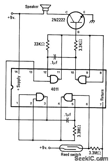 Loudspeaker is energized by 4011 audio oscillator and 2N2222 transistor operating from 9-V battery when ice melts and allows permanent magnet to drop on reed switch and close it. Magnet is bonded to wall inside of freezer with mixture of antifreeze and water.-J. A. Sandier, 11 Projects under $11, Modern Electronics, June 1978, p 54-58.