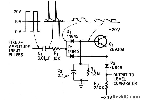 Linear staircase generator delivers d-c output voltage proportional to repetition frequency of input pulses while reiecting short-duration spurious noise pulses.-M. Merlen and D.Grossman, Interrogator Circuit Can Tell Good Data from Bad, Electronics, 37:20, p58-59.