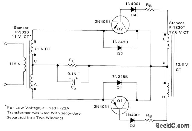 Transistors are biased on alternately by AC input voltage, to supply load current on alternate half-cycles. Silicon diodes D1 and D2 protect transistors from charging current of capacitive load when circuit is turned on, Capacitor discharge problems are minimized by use of diodes D3 and D4 in base circuits of transistors.-B. C. Shiner, Improving the Effilciency of Low Voltage, High-Current Rectification, Motorola, Phoenix, AZ, 1973, AN-517, p 4.