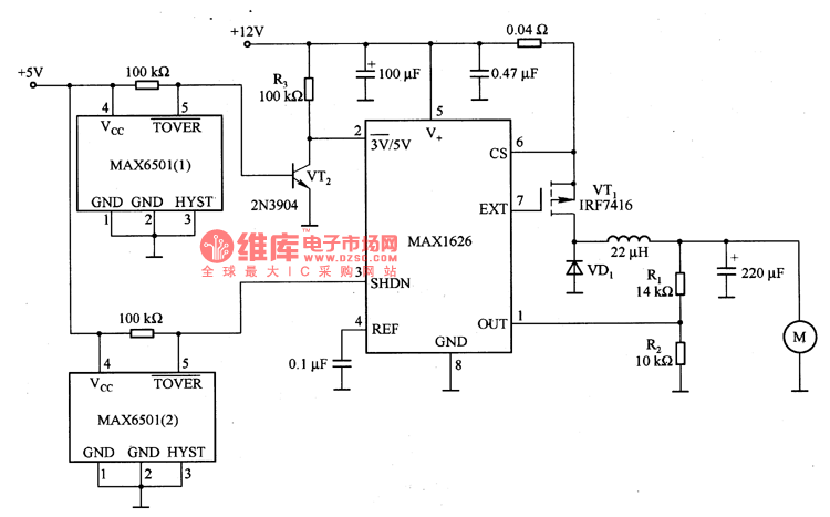 The aboved picture is fan speed control circuit composed of MAX1626.This circuit reduces the computer, the temperature controller and alarm system noise and power consumption by choosing the MDH626 shut-off and the output voltage function. Logic level is added to 2 (3 V / 5 V) and 3 (SHDN) pins and at the same time,feedback resistance (Rl and R2) are chosen to set the output voltage.Usually, a low output voltage U (01) (here it's eight V) is determined by dividing resistor R1 and R2.High output voltage U (02) here it's l2V) is determined by chip the output (4 feet) voltage.When environment temperature is more than the threshold values within the chip, the MAX6501 (1) and (2) leakage output(TOVER) of monitoring temperature becomes low PWL.