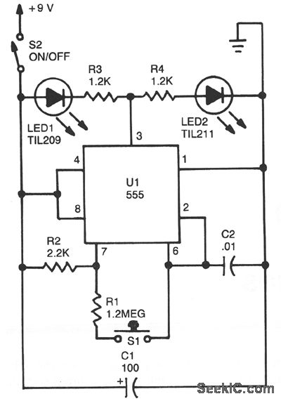 The circuit is basically a 555 astable circuit that divides two LEDs, LED1 and LED2. LED2 is switched on when the output of U1 is high, and LED1 is activated when its output is low. When U1 oscillates, LED1 and LED2 switch on alternately as the output of U1 switches from state to state. Resistor R1's value is high in comparison to R2, so the waveform at the output is a square wave with a mark/space ratio of nearly one-to-one. When you release S1, you break the circuit and U1 latches whatever the output state happens to be at the time.