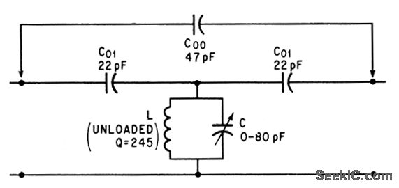 Bridging conventional bandpass filter with single capacitor C00 converts to general fiber having both sharp pass and reject behavior at adjacent frequencies. For values shown, bandpass occurs at 20 Mc and peak rejection frequency is 19.15 Mc.-R. Kurzrok, Single Component Changes Bandpass into General Filter, Electronics, 39:8, p 95-96.