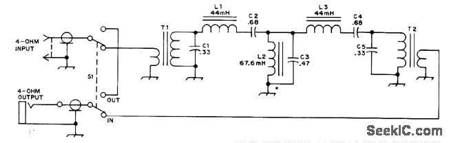 Used between 8-ohm output of communication receiver and 8-ohm Loud-speaker or low-impedance phones, to suppress Continuous Random Unwanted Disturbances on voice transmissions. Passband is 355 to 2530 Hz at 3-dB points. L1 and L3 are 4a-mH toroids.L2 is 88-mH toroid with 94 turns removed. T1 and T2 are 88-mH toroids with 100 turns No.28 enamel wound over original winding of each for primary.-R. M. Myers, The SSB Crud-O-Ject, QST, May 1974, p 23-25 and 56