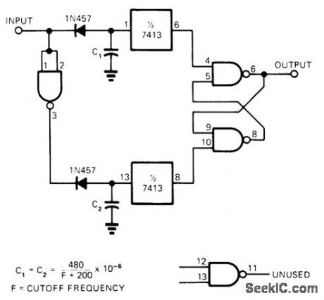 Used to retrieve pulse train data from noisy signal line. Filtering is achieved with SN7400 quad two-input NAND gate, SN7413 dual four-input Schmitt trigger, two diodes, and two capacitors. One gate of SN7400 is used as inverter driving pulse delay operating on negative-going transition of input pignal. Other Schmitt trigger, diode, and capacitor provide delay on positive-going transition. Any additional pulses occurring during delaycirouit time-out resets delay time without affecting output.-T. H. Haydon. Low-Pass Digital Filter. EDN Magazine. Nov. 20. 1973. p 85. (View)