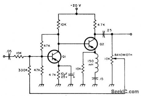 Provides bandwidth of 2000 Hz and midband gain of 1 for applications requiring narrow-bandwidth bandpass active filter. Design procedure is given.- Audio Handbook, National Semiconductor, Santa Clara, CA, 1977, p 2-52-2-53. (View)