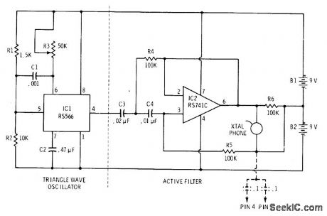 Circuit includes variable high-frequency source supplying triangle-wave input to filter for demonstrating high-pass action. If long supply leads cause oscillation, connect 0.1-μF capacitors between ground and supply pins 4 and 7 as shown.-F. M. Mims, lntegrated Circuit Projects, Vol. 4, Radio Shack, Fort Worth, TX, 1977, 2nd Ed., p 87-94. (View)