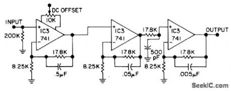 Used in acoustics for measuring transducer characteristics, absorption-reflection and transmission coefficients of materials, and room parameters such as reverberation time. Offsets falloff of detected noise signal at low frequencies by using filter shown to convert random-noise source from constant energy per hertz (white-noise frequency spectrum) to constant energy per octave (pink-noise response). Filter covers audio range from 10 Hz to 20 kHz, providing -20 dB per decade transmission characteristics with three 741 opamp stages. Frequency characteristic is independent of source and load impedances. Supply voltages can be from ±6 to ±18 V.-R. Mauro, Simple Pink Noise Filter. Audio. March 1977. p 36 and 38.   (View)