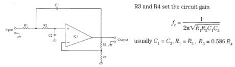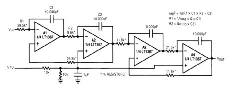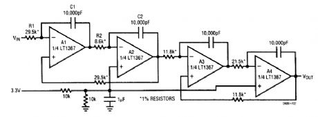 This filter will be useful for anti-aliasing or band limiting in an audio system.The op amp is a Linear Technology, LT1124,LT1355,or LT1169. (View)